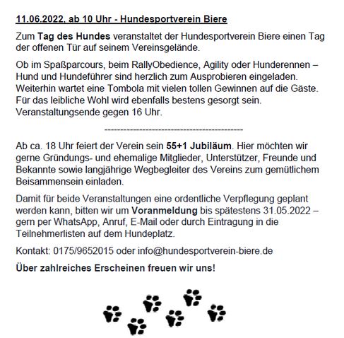 Tag des Hundes:Die für den 06. und 07. Juni 2020 geplante Veranstaltung zum Tag des Hundes wird nicht stattfinden. Wir planen stattdessen ein Herbstfest - natürlich nur, wenn die CORONA-Lage sich bis dahin entspannt hat...